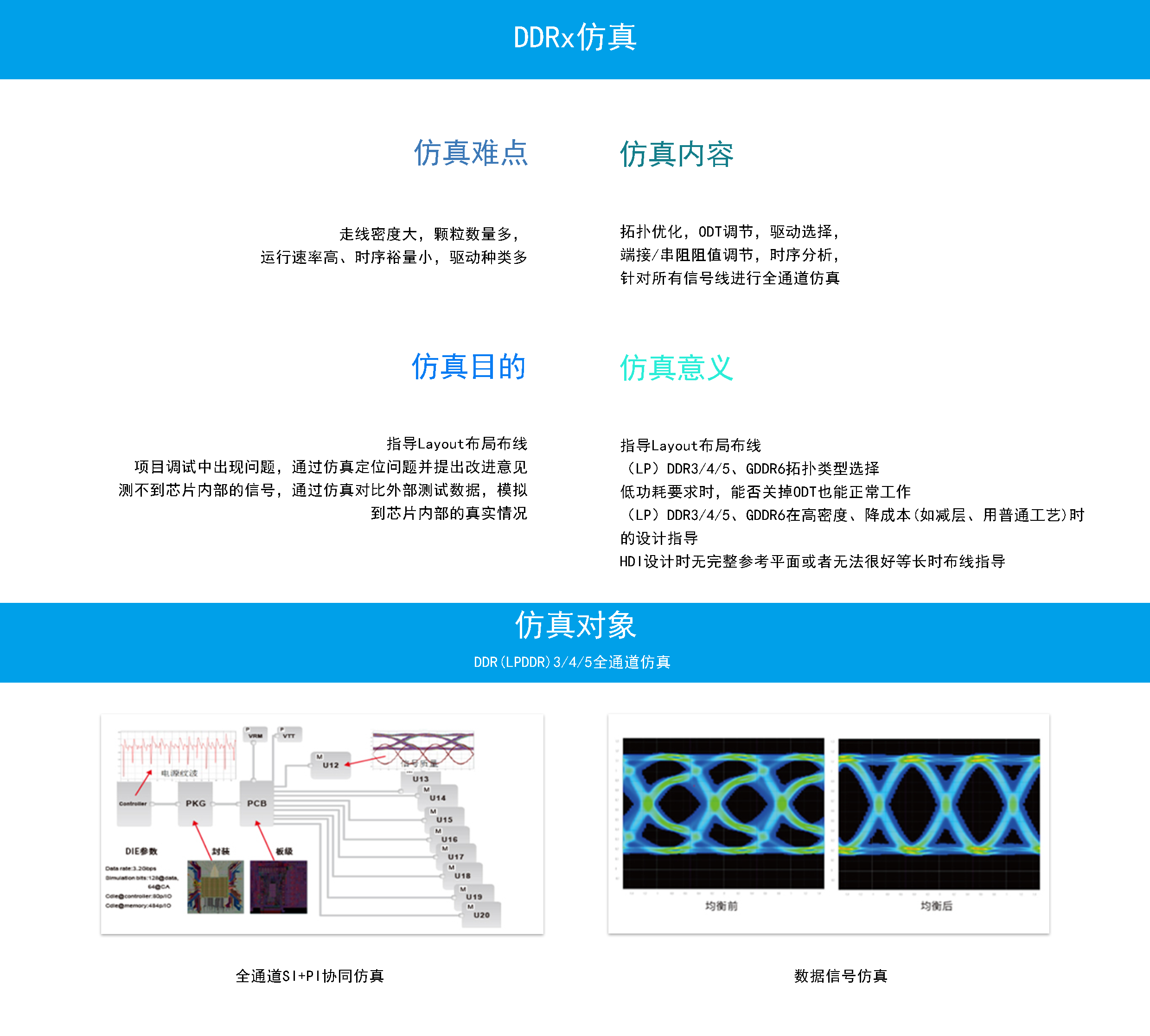 拓扑优化,ODT调节,驱动选择,端接/串阻阻值调节,时序分析,针对所有信号线进行全通道仿真,指导Layout布局布,(LP)DDR3/4/5、GDDR6拓扑类型选择,低功耗要求时,能否关掉ODT也能正常工作