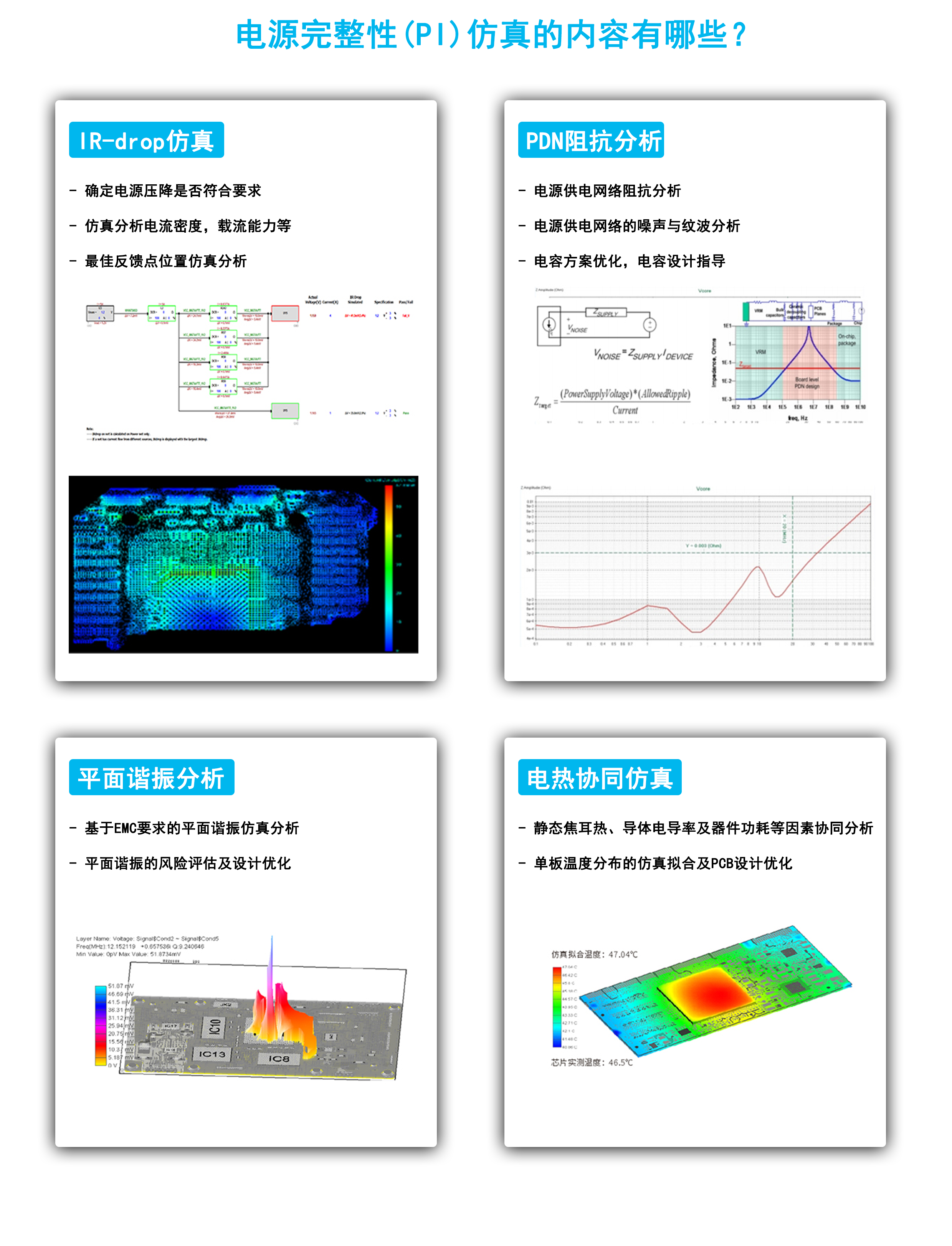 确定电源压降是否符合要求,仿真分析电流密度,载流能力等,最佳反馈点位置仿真分析,静态焦耳热、导体电导率及器件功耗等因素协同分析,单板温度分布的仿真拟合及PCB设计优化