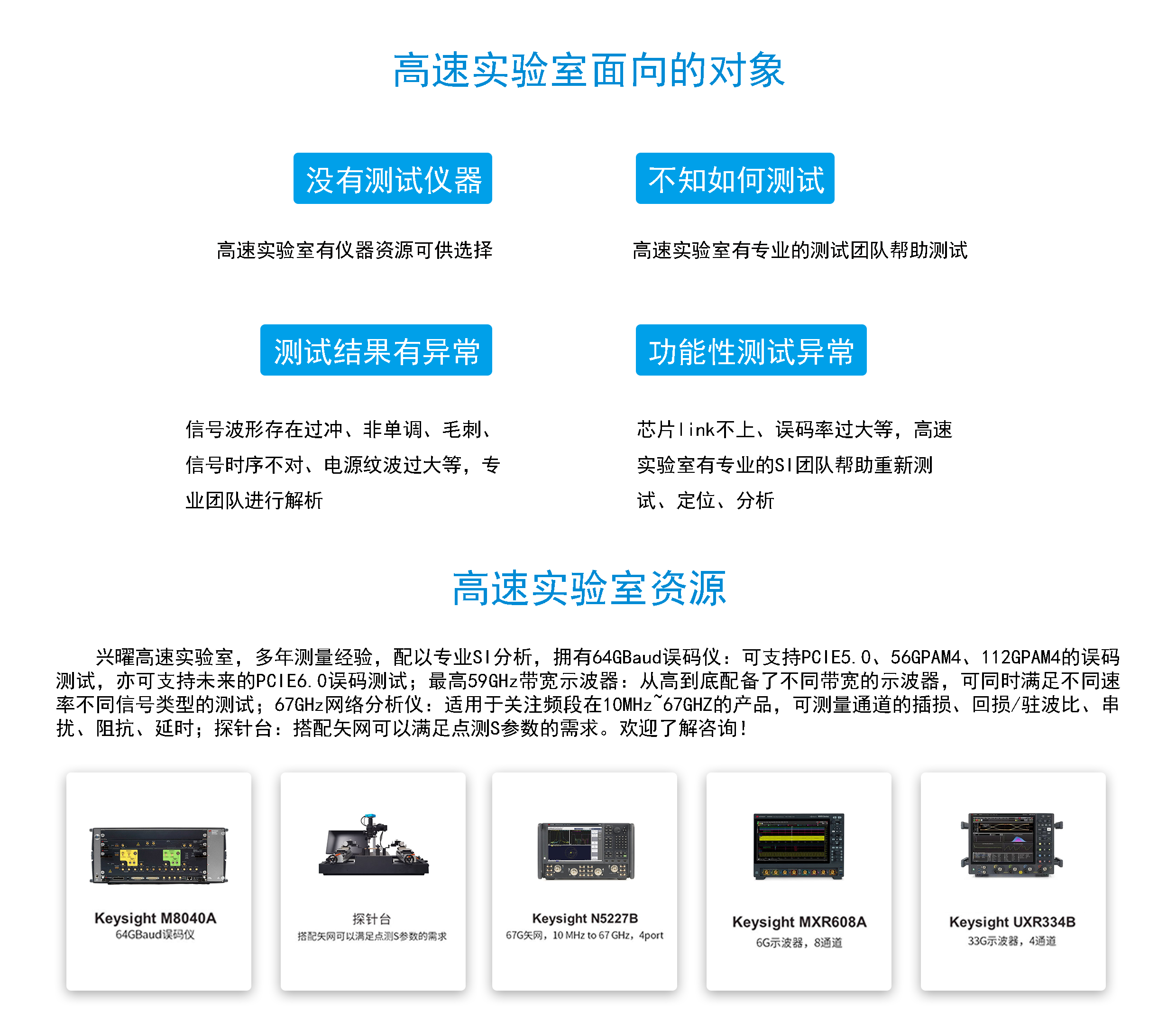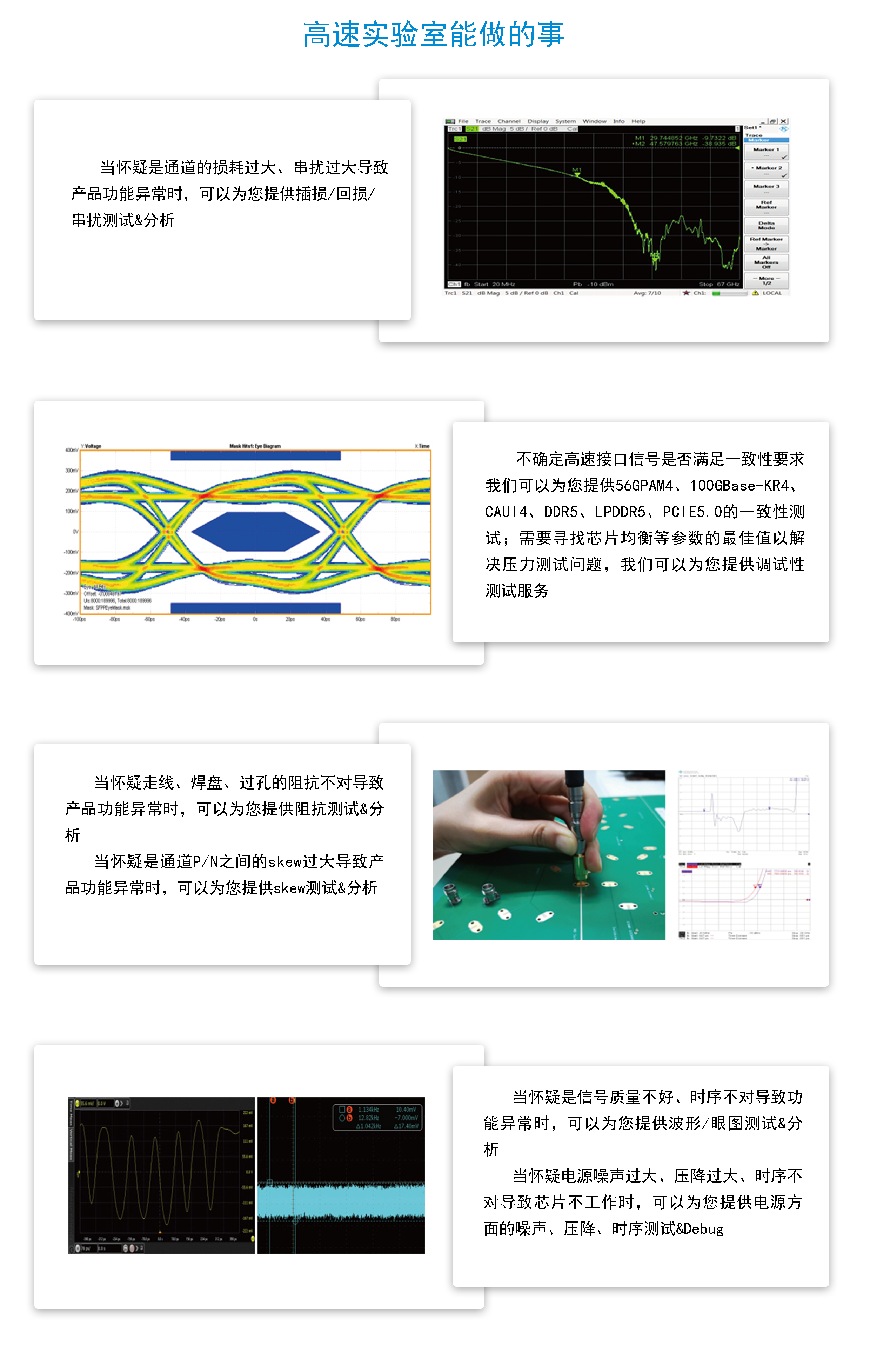 兴曜高速实验室,多年测量经验,配以专业SI分析,拥有64GBaud误码仪:可支持PCIE5.0、56GPAM4、112GPAM4的误码测试,亦可支持未来的PCIE6.0误码测试;最高59GHz带宽示波器:从高到底配备了不同带宽的示波器,可同时满足不同速率不同信号类型的测试;67GHz网络分析仪:适用于关注频段在10MHz~67GHZ的产品,可测量通道的插损、回损/驻波比、串扰、阻抗、延时;探针台:搭配矢网可以满足点测S参数的需求。欢迎了解咨询!